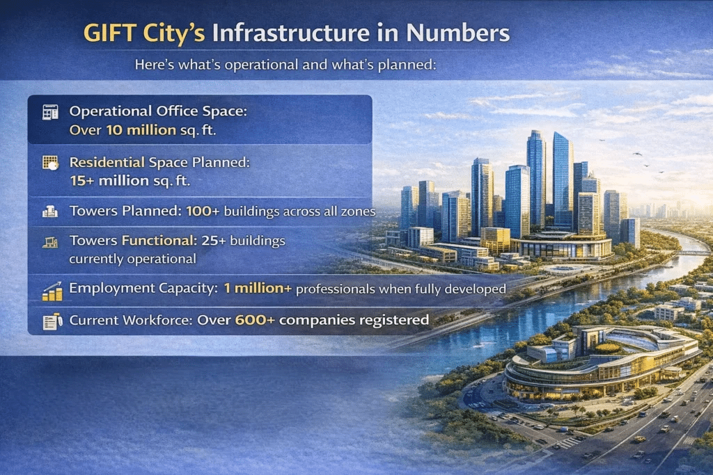 GIFT City is as good as the best business areas worldwide. It’s a top spot for companies to grow. It has cool tech like district cooling and waste collection.