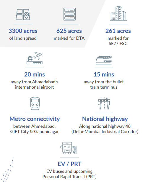 GIFT City has great infrastructure. It’s connected by highways and has a metro station. It’s close to the airport and a railway station.